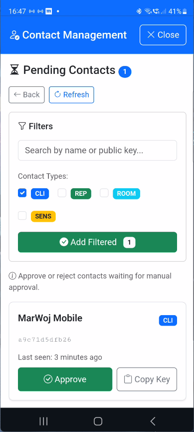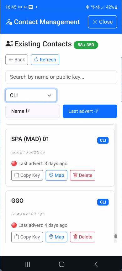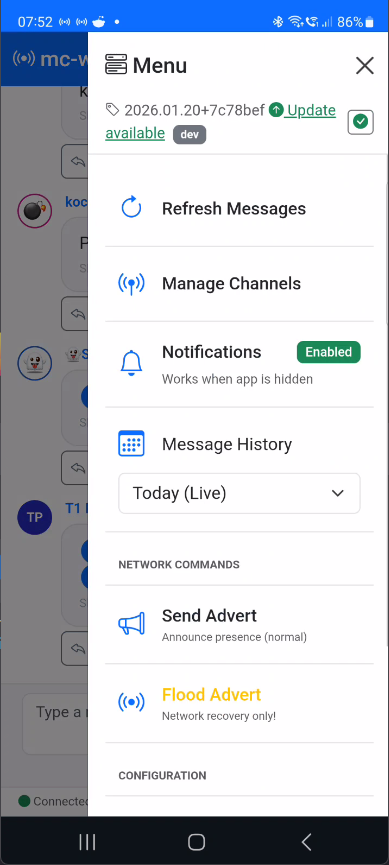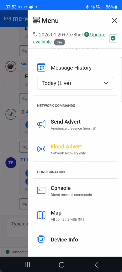 - Console - Access via menu (☰) → "Console" for direct meshcli commands