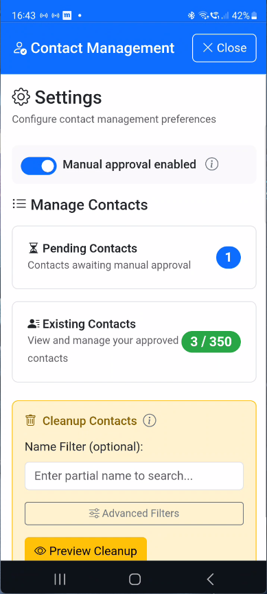 - Contact management - Manual approval mode, filtering, protection, cleanup tools