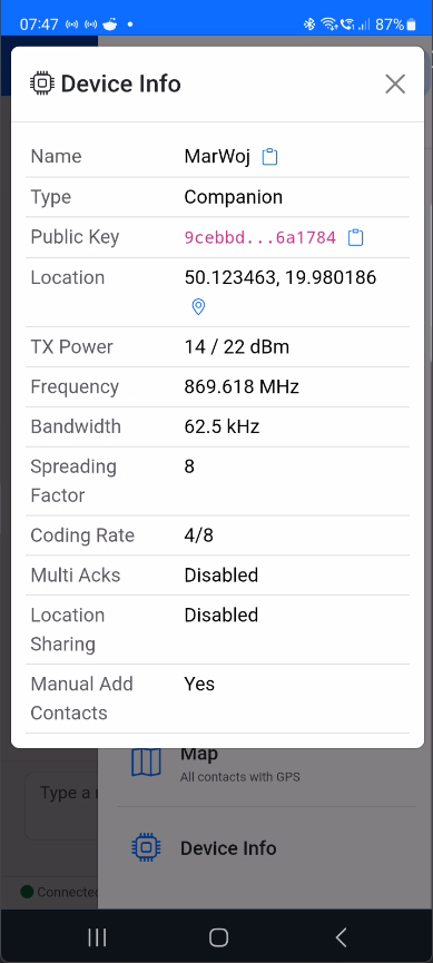 Companion USBrole. - Configure the device with the Meshcore mobile app (from Google Play Store / App Store): Name, Location (optional), Preset