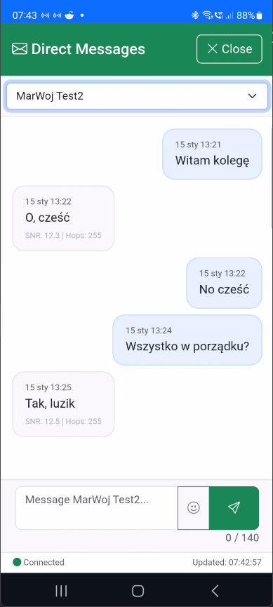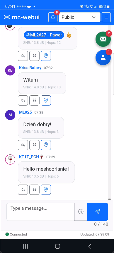 - Send messages - Type in the text field and press Enter (135 bytes for channels, 150 bytes for DM)