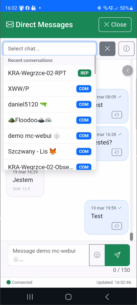 - Direct Messages (DM) - Searchable contact selector, delivery tracking, configurable retry