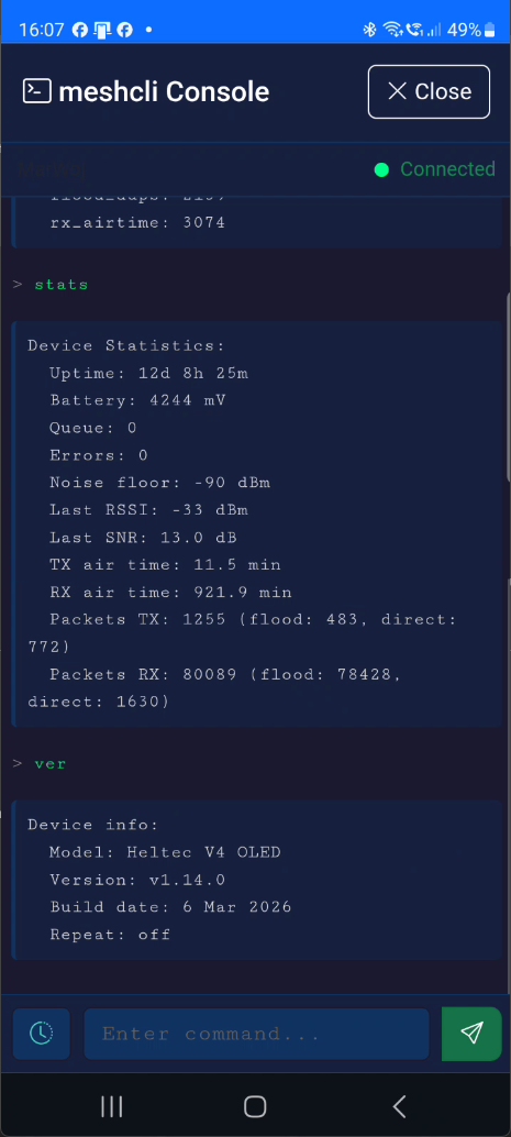 - Console - Access via menu (☰) → "Console" for MeshCore commands