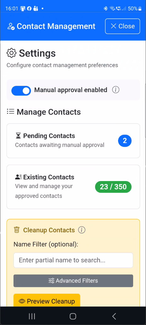 - Optional: Enable manual contact approval in Contact Management